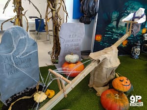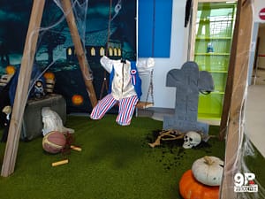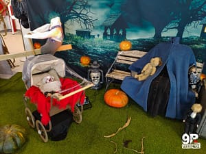 Décors automatisés, fleurs de ballon aux couleurs d’Halloween suspendues au plafond avec quelques accessoires : araignées géantes, fantômes, zombies etc… Mouahahah…. Bienvenu Halloween !